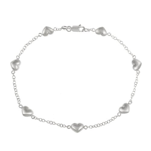 Display your sweet side with this Sterling Silver Anklet with Puffy Heart Stations. The casual accessory offers a delicate silver-toned 925 sterling rolo chain, which fits comfortably on the ankle and features seven polished puffy-style hearts. The hearts are sized just right for ankles with a .23-inch height and .43-inch width. The 10-inch chain features a secure lobster-claw clasp.