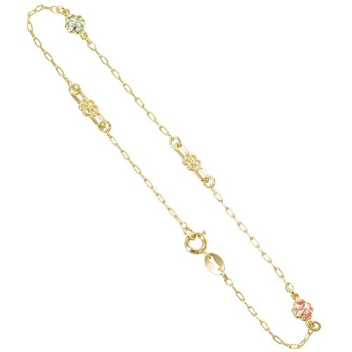 Nickel Free 18 KT Gold Layered Jewelry Anklet. 13 x 5mm Floral design with 5mm Pink and Aqua Stone on Yellow Gold tone Link Chain.