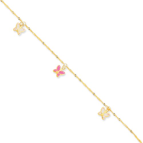 This anklet is crafted with 14k yellow gold and features enameled butterly charms and is adjustable. 10 inches in length and includes a spring lock closure. Made in U.S.A.