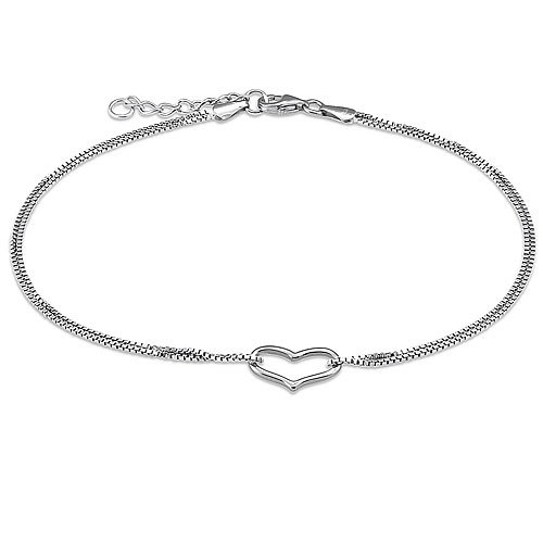 This beautiful heart double chain anklet is made of fine sterling silver, plated with rhodium, and stamped with 925 quality mark. Anklet length size is 9 inch with 1 inch extension. Fastens with lobster claw clasp. Berricle.com style number #a019.